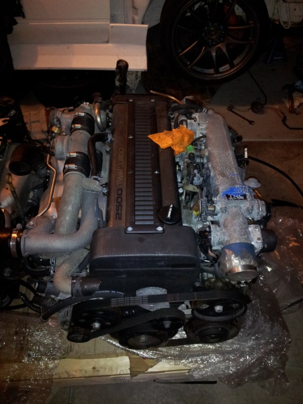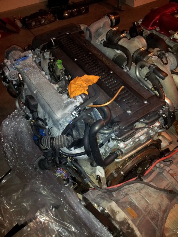 So after a short wait, the 1JZ has finally got to the house and looks awesome. The 1J definitely dwarfs the SR20DET that came in the crate with my motor. Yao is anxious in getting the new motor in the car and has already been on a shopping spree trying to get everything needed to start the motor. The warranty is only for 30 DAYS!, so the race is on to get this thing started. Thankfully, people like Forest and Jesse provide a great source of information on getting this thing up and running. So stay tuned for install and running pics!