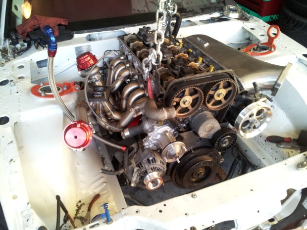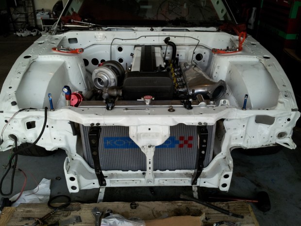 Thanks to some friends and teammates, we got the motor test fitted in the engine bay. Already we noticed some issues we are going to have to overcome i.e wastegate dump pipes, downpipe, and intercooler piping. My welder is a beast, so I’m sure we’ll figure it out.