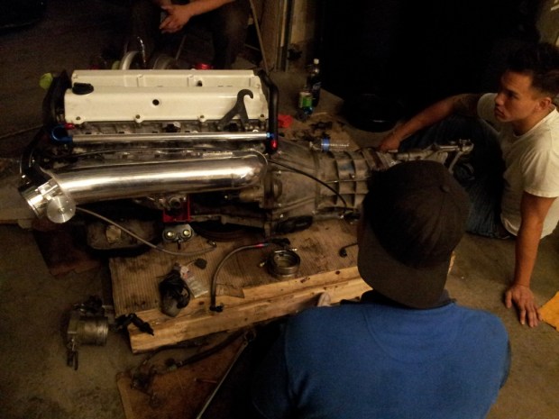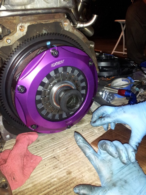 Got the Exedy Hyper Twin on the motor and the tranny put on. Also got the motor in the car and when I say tight fit….I mean REALLY tight fit. Had to bang out the fire wall a bit to even get the motor to seat the motor mounts. Had to also cut the shifter hole in the car (expected).