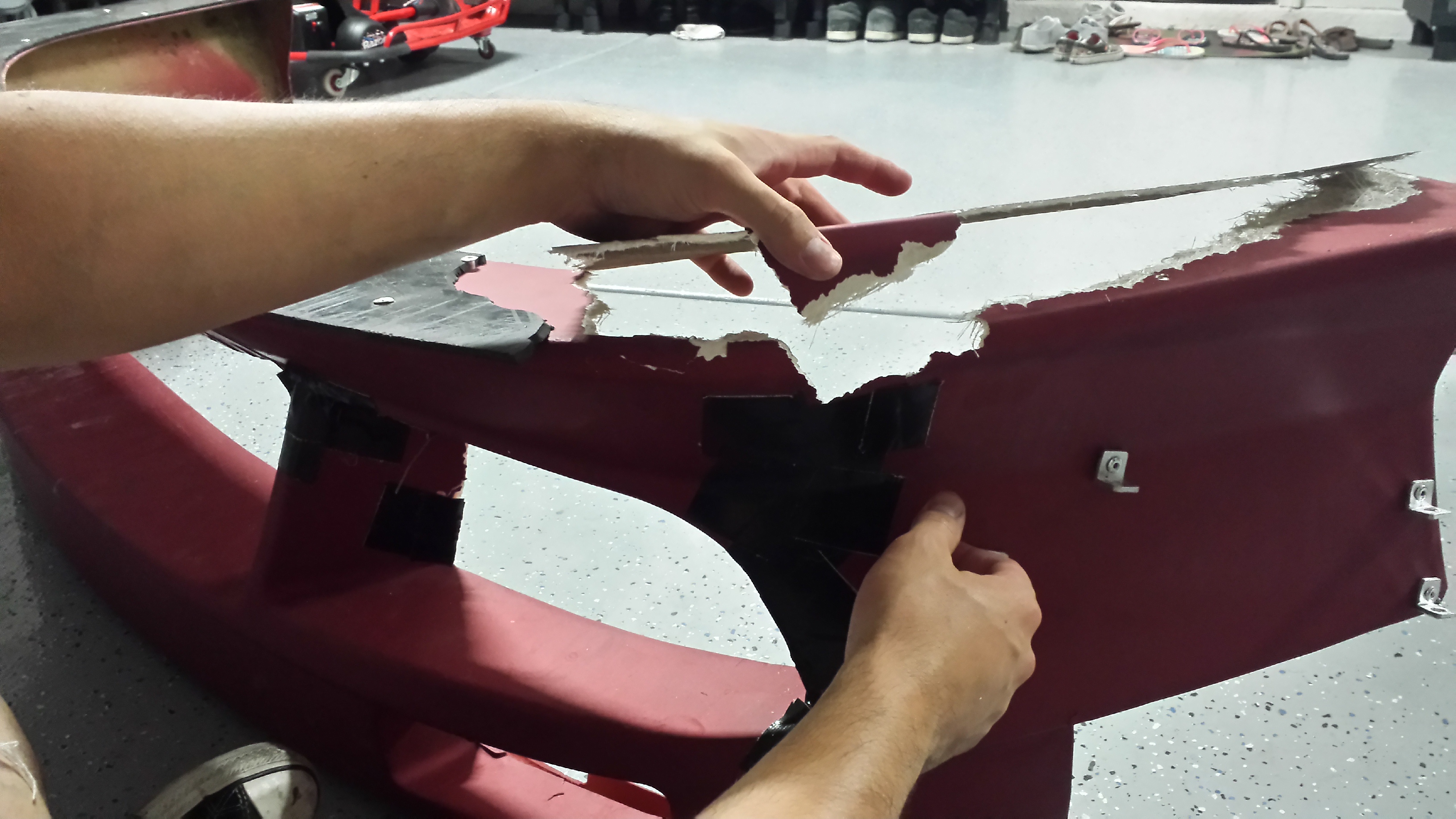 This original DMAX type 3 bumper has only seen damage off the track. Yao caught a curb and managed to mess up the front bumper. Luckily, Eric is able to help get things put back together and repaired! Looking better already