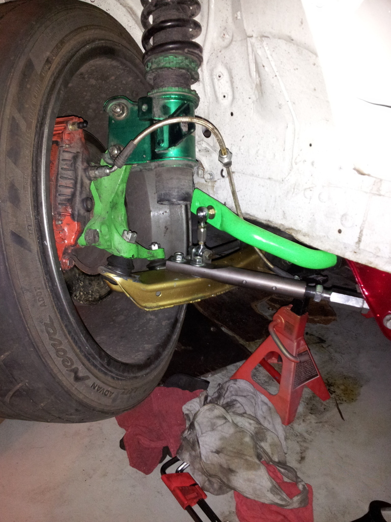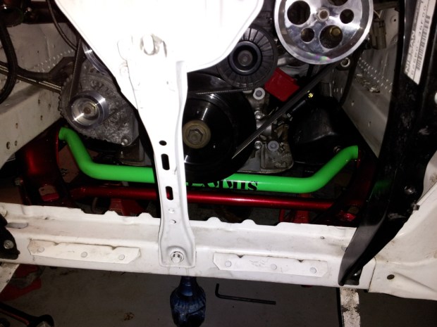 The next issue to tackle was actually mounting this motor to the car. Forest Wang at Get Nutz!! Labs took care of that problem with a custom engine mount brackets. Yao got them and had them powder coated a nice Red to set them off.